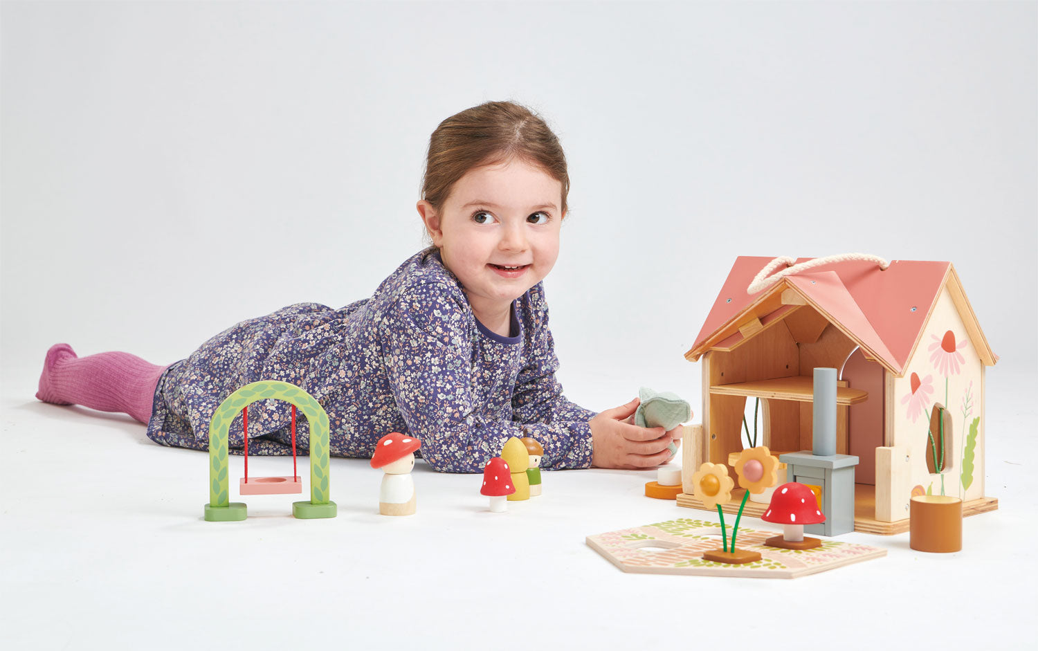 The back panel lies flat to become a garden, on to which can be placed a pretty swing, two flowers, and a toadstool.