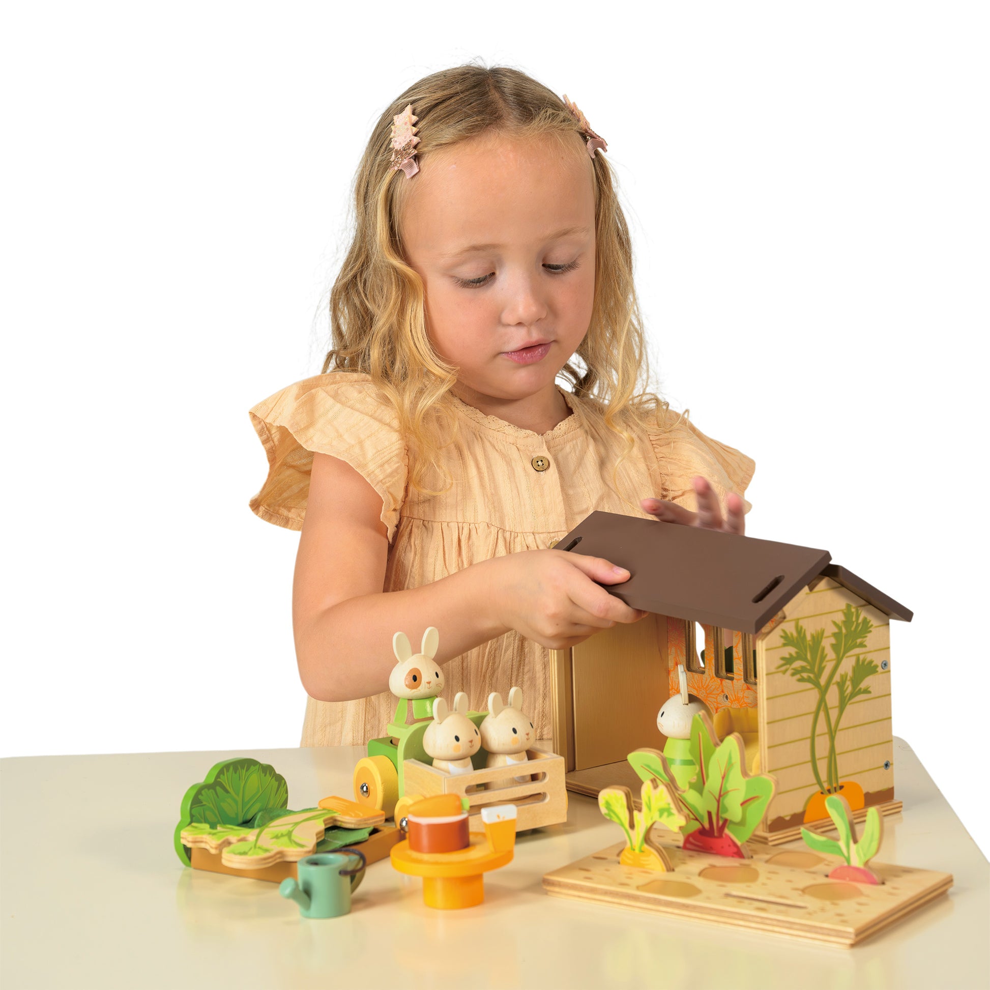 • Heavy Lifting: A bright green wooden tractor with a detachable trailer, perfectly sized for transporting bunnies or their harvest.
