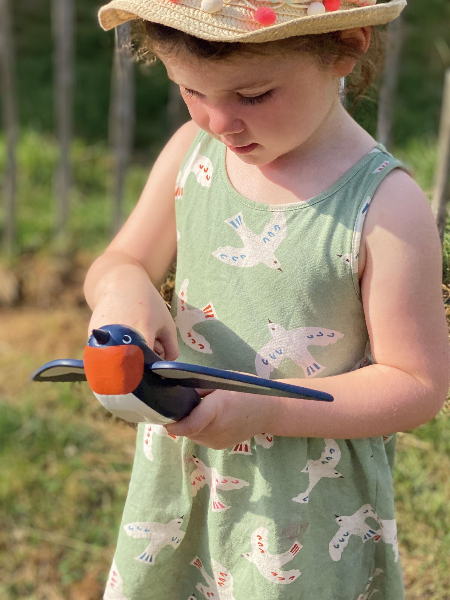 A fun, cool new addition to the Merrywood Tales characters! This little wooden doll comes in his very own mode of transport, Swifty the Swallow bird. Spud the pilot doll has his name written underneath just like all the other Merrywood characters. Sometimes, Swifty will also happily give the other characters in Merrywood a ride too!